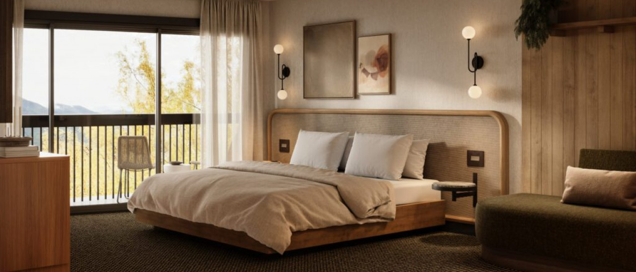 The Kenrick blends contemporary comfort with rugged alpine charm, offering spacious rooms and suites with premium bedding, air conditioning, free high-speed Wi-Fi, 65-inch Smart TVs, mini fridges and some rooms with balconies and mountain views.