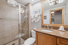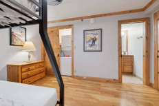 This two-level, ski-in/ski-out retreat, steps from the Elkhorn Lift and finished in sophisticated neutrals, offers a great room with a gas fireplace, flatscreen TV and sleeper sofa, a contemporary kitchen with stainless steel appliances and granite countertops, plus a dining table for six. Additional features include two guest suites, each with a lavish, attached bathroom (primary has a king size bed, secondary has a queen size bed), an enclosed/lofted bedroom with a twin-over-queen bunk bed and desk/work space, hardwood flooring, a stacked washer/dryer, and underground parking for one vehicle. More...