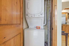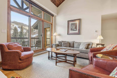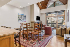 This comfortable, third floor, ski-in/ski-out residence, steps from the Elkhorn Lift, offers a family room with a gas fireplace, a full kitchen with stainless steel appliances, plus a dining table for seven. Additional features include a primary suite with a king size bed and attached bathroom, a guest bedroom with two twin beds, a stacked washer/dryer, and underground parking for one vehicle. More...