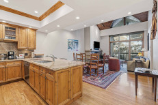 This first floor, ski-in/ski-out residence, steps from the Elkhorn Lift, offers a family room with a gas fireplace, sleeper sofa and flatscreen TV, a complete kitchen with stainless steel appliances, plus a dining table for eight. Additional features include a primary suite with a king size bed and attached bathroom, a guest bedroom with two twin beds, a stacked washer/dryer, and underground parking for one vehicle. More...