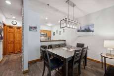 This chic, mountain contemporary residence offers a family room with a wood burning fireplace and flatscreen TV, a premium chef’s kitchen with marble countertops and stainless steel appliances (including a wine refrigerator), plus a dining table for six. Additional features include two guest suites, each with an attached, luxurious bathroom and flatscreen TV (primary has a king size bed, secondary has a king size bed and twin-over-double bunk bed), hardwood flooring and barnwood accents throughout, a washer/dryer, covered parking for one vehicle, and access to a private ski locker room. More...