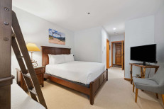 This Platinum 2 bedroom + loft, slope-side, top-floor, corner residence offers a spacious and welcoming living room with vaulted ceilings, views of the slopes and lifts, wood-burning fireplace, chef's kitchen stocked with all appliances needed to cook great meals, granite countertops, and plenty of sunshine throughout the entire day. All bedrooms include attached full bathrooms, ceiling fans, and flat screen TVs. The oversized primary bedroom offers a king-size bed, sitting room, private balcony, desk/workspace, and bathroom with a larger fully tiled shower and double bathroom vanity. Bedroom 2 on the main floor has 2 queen-sized beds, and the second-floor loft is enclosed for privacy from the family room, accessible by stairs, has 2 twin beds that can be converted to a king when requested. More...