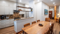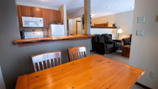 This second floor vacation rental overlooks the Mighty Moose beginners ski area. With 2 bedrooms and 2 bathrooms, this self-contained condo features a river rock gas fireplace and flatscreen television. An open concept kitchen looks through to the nicely furnished dining and lounge area. The master bedroom has a Queen bed and there are two twins over a double bed in the second bedroom. A sofa pullout in the living room brings the maximum occupancy of this condo to eight. Snow Creek Lodge has all the amenities to finish your ski day with a hot tub, outdoor heated pool, gym. The lodge offers an underground parking area, communal BBQ space and a rental shop.