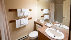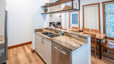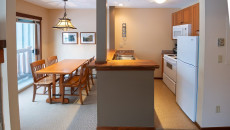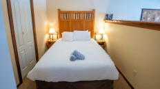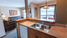 Snow Creek Lodge 101 is a spacious end unit 2 bedroom condo suite with over 900 square feet to spread out. Nicely appointed with 2 bedrooms, 2 bathrooms, a full kitchen, dining area and living room, this vacation rental also features a wrap-around balcony overlooking forest and the beginner slopes. Snow Creek Lodge is in a prime Ski in / Ski out location, so you can easily to stop in for a ski break and a bite to eat in your full kitchen during the day. The master bedroom of Snow Creek 101 features a King bed with a Queen sized bed in the second bedroom. The living area offers a flat screen television, DVD player and river rock gas fireplace, as well as a pull out sofa bringing the maximum occupancy for this condo to 6 guests. More...
