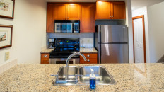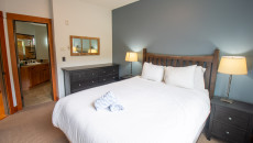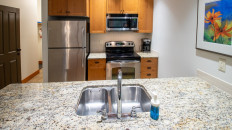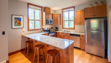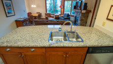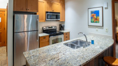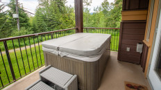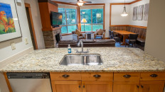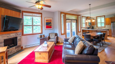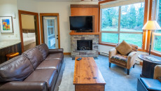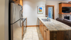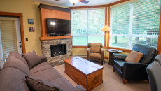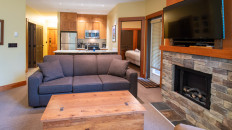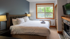 The open plan living area includes a full kitchen with stainless steel alliances, granite countertops, a kitchen island, and dining room table. There is an electric fireplace, cable TV, free Wi-Fi, washer/dryer, ski storage, and your own private hot tub in the walk-out deck area. There is a King bed in the master bedroom, 2 x Twin beds in the second bedroom, and a sofa pull-out in the living area- sleeping up to 6 guests. Each bedroom has its own TV and fireplace for those lazy days sleeping in! One of the bedrooms also has an air-conditioning unit which will help cool the whole condo in the summer months. More...