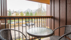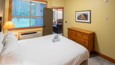 The condo features a full kitchen with all major appliances, plates, cups and cutlery. The kitchen opens on to the living room which comes complete with a gas fireplace, cable TV, free Wi-Fi and a private balcony with views across the Elk Valley. There is a Queen bed in the master bedroom, 2 x Twin beds in the second bedroom, and a sofa pull-out in the living room – sleeping up to 6 guests in total. There is an air conditioning unit in the second bedroom that will help cool the entire condo in the summer and there is a bathroom attached to each bedroom. Guests will also enjoy access to a fitness room, coin-operated laundry, ski storage. The ski resort base area and restaurants are within walking distance of Timberline Lodges.