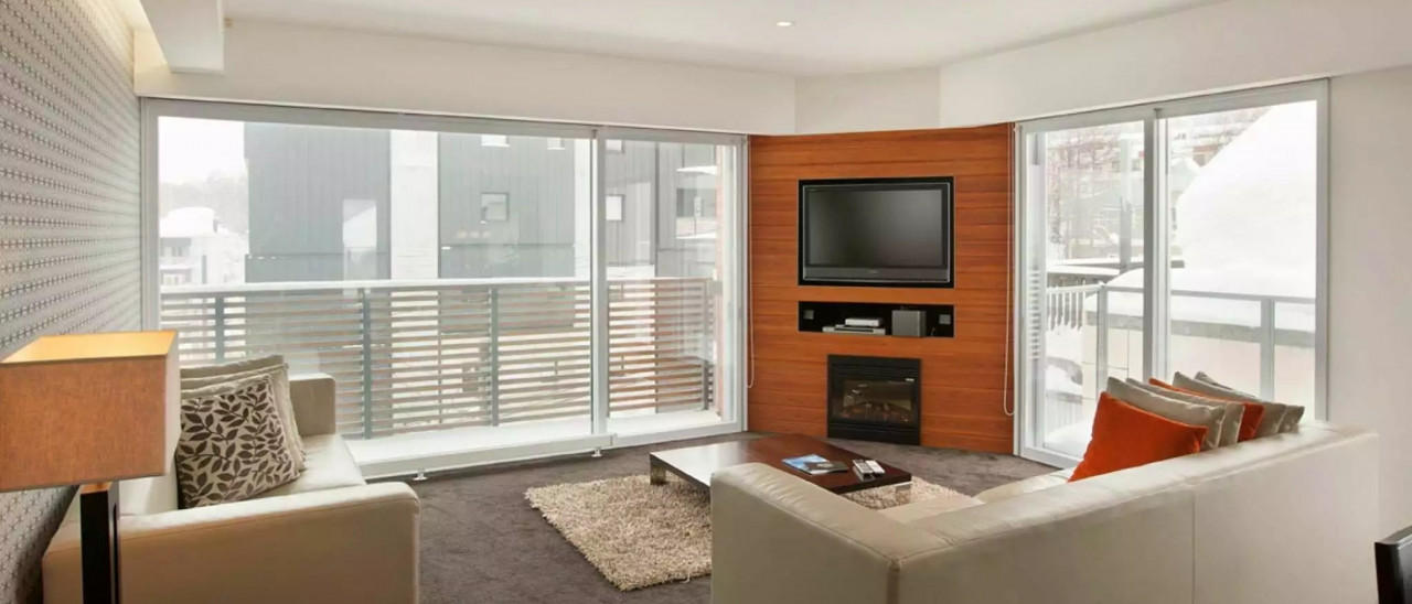 The spacious 1- to 3-bedroom apartments each feature modern design, an open-plan kitchen and living room, and a private balcony. The generous floor-to-ceiling windows offer restful views of the village and the mountains beyond.