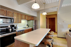 The one bedrooms plus loft, approximately 830 square feet. There is a spacious living room and a fully equipped kitchen. Bedding in the master bedroom is a king. Bedding in the loft is 2 double beds. There is 1 full bathroom and a half bath in the loft. The living room has a sleeper sofa. Non-smoking and no pets. The Timberline has an outdoor heated swimming pool, 2 hot tubs, sauna, locker rooms and guest laundry. Restaurant on site for dinner except during the off seasons.