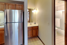 The studio condominiums are approximately 365 square feet/ 34 sq. m. Studios have a common living and sleeping area. There is an efficiency kitchen complete with microwave, mini refrigerator and two-burner stove. A queen-size bed is located in the common area. Some units have additional sofa beds. There is one full bathroom. This is the perfect size for one or two people.