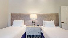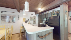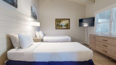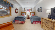 Top of the Village Trails 208, located on the third floor, features 1,080 square feet of living space with exposed ceiling beams, light grey carpeting, and a fun, Western decor. This residence includes two bedrooms and two bathrooms. The master bedroom has a king bed and a private bathroom, while the guest bedroom is equipped with two twin beds and built-in twin bunk beds, with a hallway bathroom nearby. The living room features a sleeper sofa, and the fully equipped kitchen is complemented by a private deck with a gas grill. Residence includes washer/dryer More...