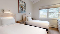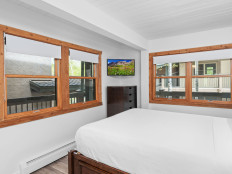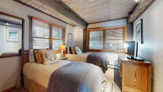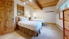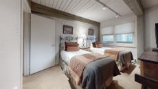 Top of the Village Slope 201, located on the second floor of the Slope building, combines mountain solitude with convenient ski-in/ski-out access. This 1,080-square-foot, two-bedroom, two-bathroom condo offers a master bedroom with a king bed and a guest bedroom with two twins and built-in bunk beds. The living area features whitewashed walls, dark ceiling beams, and a white brick fireplace, with comfortable furnishings and a private deck overlooking a small forest area. Enjoy the fully equipped kitchen with granite countertops, and relax with the on-site amenities including a gas grill, washer and dryer, and access to multiple hot tubs and a heated swimming pool. More...