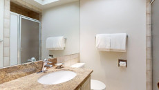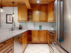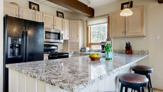 Top of the Village Trails 102 is a ground-floor condominium offering 1,080 square feet of living space with excellent ski access. The master bedroom features a king bed and an en suite bathroom, while the guest bedroom includes two twin beds. The living area provides additional sleeping with a sofa bed and features luxurious leather furniture. The fully equipped kitchen includes granite countertops and stainless steel appliances. Additional amenities include a washer and dryer, gas fireplace, and a private deck with a gas grill. More...