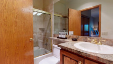 Villas 1101 is a ground-floor corner villa with 1000 square feet. The master bedroom features a king bed and a private bathroom, while the second bedroom includes a queen bed and access to a second bathroom. The den and living room offer a sleeper sofa and a cozy atmosphere with a fireplace. The fully equipped kitchen boasts granite countertops and stainless steel appliances. Additional features include a washer and dryer, individual ski storage closet, and a fireplace. More...