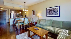 Trailhead Lodge 2103 is a luxurious one bedroom plus den condo. The unit features a fully-equipped kitchen complete with granite counters and stainless steel appliances. The living area features comfortable furnishings, a cozy gas fireplace and access to the private balcony. The unit has 3 flat screen TVs, a DVD player, and free WiFi for your enjoyment. There is also a washer and dryer in the unit (detergent provided) for your convenience. The bedroom features a king bed and attached bathroom with double vanity. There is a queen sleeper sofa in the open den and one in the living area. Amenities include a large pool, 3 hot tubs, fitness center, game room, an outdoor fire-pit, a Bar-B-Que area, central air-conditioning, a deluxe boot-drying facility, access to the Wildhorse Gondola which takes guests from the property up to Gondola Square and out winter shuttle services to take guests to shopping, dining and other area activities. More...