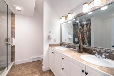 On the main level is a bedroom with a king bed, 32-inch flat screen TV and an en suite bathroom with jetted tub and separate walk-in shower. The 2nd bedroom on the main level has a king bed that can be split into 2 twins, 32-inch flat screen TV and a bathroom in the hallway with shower/tub combo. Upstairs is the master bedroom with a king bed and queen sleeper sofa, 32-inch flat screen TV, walk-in closet and ensuite bathroom with double sinks, jetted tub and separate walk-in shower. There is also a safe in the master bedroom. On this floor is another bedroom with king bed that can be split into two twins, 32-inch flat screen TV, walk-in closet and ensuite bath with jetted tub and separate shower.