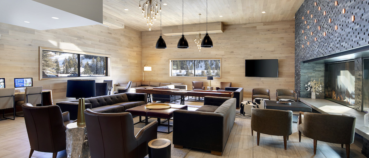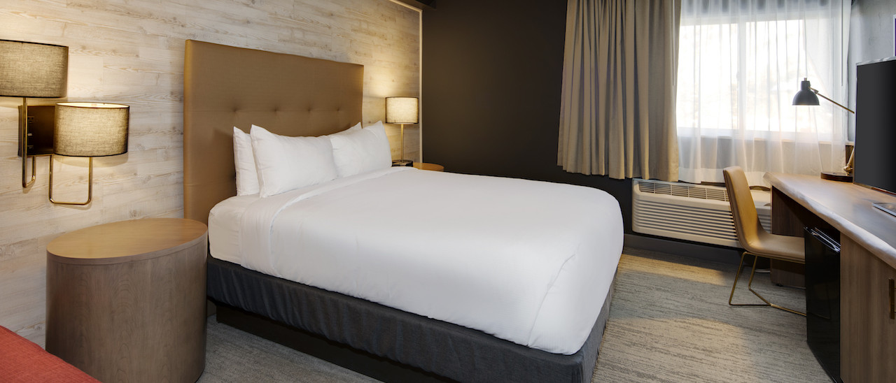 734 sq. ft. one-bedroom bi-level suite with one king bed, featuring a separate living area with fireplace, sofa bed and fully equipped kitchen (refrigerator, microwave, and stove). All guest rooms feature mountain modern design and include: Wi-Fi, 50-inch HDTV, mini-fridge, coffeemaker, live edge wood desk, wood accent wall, USB ports, back-lit mirrors and Carrara Quartz bath vanity.
