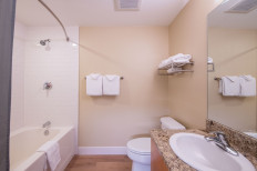 Simple and comfortable two bedroom, two bath condominium looking into the amenity courtyard of Fraser Crossing. This condo has granite counter-tops and standard furnishings, a dining area, and a washer/dryer set. There is a hotel size king bed in the master bedroom with ensuite bathroom, a queen size bed in the second bedroom, sectional couch with 2- twin folding foam beds to accommodate sleeping 6 (no sofa sleeper).