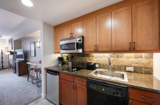 Simple and comfortable two bedroom, two bath condominium with balcony facing the ski resort and Village area. This condo has granite counter-tops and standard furnishings, a dining area, and washer/dryer set. There is a hotel size king bed in the master bedroom with ensuite bathroom, a queen size bed in the second bedroom, and a sleeper sofa that pulls out in the living area.
