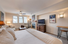 Adorable studio on the amenity deck of Founders Pointe offers easy access to the patio hot tub and stunning views of the mountain. This studio has a queen size bed with a sofa sleeper that pulls out next to it. The galley kitchen is perfect for stopping in for lunch and to enjoy a drink in front of the gas burning fireplace. The homeowner has added many personal touches for guests to enjoy and you will feel like you are home away from home.