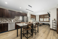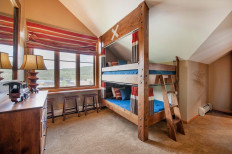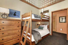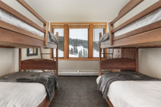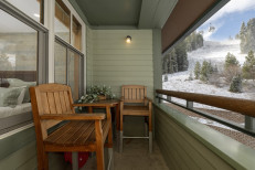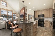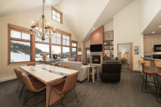 Grand two bedroom two bathroom condominium located on the second floor with many upgrades and custom features including a handmade boot locker at the entry, rock tile floor in the kitchen, remodeled bathrooms with rain shower heads, fine leather sofa, and wide open kitchen to dining area for gathering. This condo has a perfect view of the slopes to watch skiers and bikers from the balcony. Enjoy the ski-in/ski-out luxury from the second floor common entry as well as being just down the hall from the hot tubs. The master bedroom has king size bed and a twin over twin bunk bed with ensuite bathroom, the second bedroom has a queen over queen bunk bed for maximum sleeping quarters. No sofa sleeper.