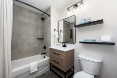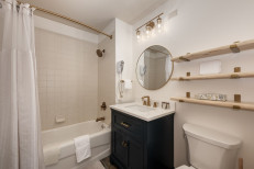 This one bedroom condo has soaring vaulted ceilings and a spectacular view of the Gondola, ski slopes, and the Village Plaza. Start your morning taking in the mountain views from your private balcony or relaxing by the gas fireplace. The condo features new flooring and contemporary furnishings like ottoman style seating and fashionable grays and blues for a warm and cozy mountain retreat. The master bedroom has a queen size bed, new furniture, and the bathroom right next to it. The full size pull out sofa will comfortably sleep 2 small children or a single adult.