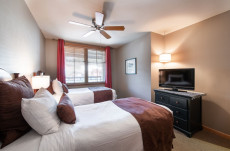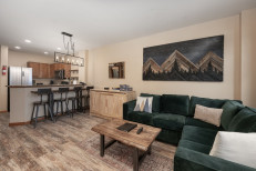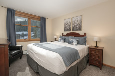 Three bedroom select- Cozy mountainside condominium on the 6th floor with great views of the slopes, this corner condo has three bedrooms with a King in the main bedroom and ensuite bathroom, a queen in the second bedroom, and 2 twin over twin bunk beds in the third bedroom with an ensuite bathroom. No sofa sleeper in the living room. Custom walnut cabinets and breakfast counter nook round out a full kitchen and a washer dryer combo compliments all you need for a perfect vacation.