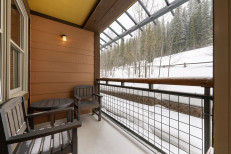 This convenient two bedroom, two bathroom condominium is just one floor up from the hot tubs and Corridor Ski Trail. Take in views of the forest from the balcony overlooking skiers and bikers as they descend the trails. A large sectional couch in the living area encourages family get together time for movie night or games. The master bedroom has a king size bed and ensuite bathroom, the second bedroom has two twin beds, and part of the sofa in the living room pulls out for additional room.