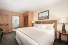Contemporary first floor ski in/ski out Zephyr Mountain Lodge one bedroom condominium with convenient access to The Village. The bedroom has a king size bed with a L-shaped sofa sleeper in the living area.